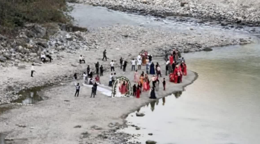 अल्मोड़ा: उत्तराखंड में वेडिंग डेस्टिनेशन हब बनाने के लिए राज्य सरकार जुटी है, वहीं सल्ट के मर्चूला में एक विवाह समारोह का स्थल विवाद का कारण बन गया. यहां रामगंगा और बदनगढ़ नदी के संगम के पास स्थित एक पुराने अंत्येष्टि स्थल पर जयमाला की रस्म निभाई गई, जिसका वीडियो सोशल मीडिया पर वायरल होने के बाद विवाद गहरा गया है. तहसीलदार आबिद अली ने कहा कि रिजॉर्ट संचालक से पूछताछ कर कार्रवाई की जाएगी. श्मशान घाट में इस तरह की गतिविधि को उन्होंने भी गंभीर माना है.